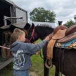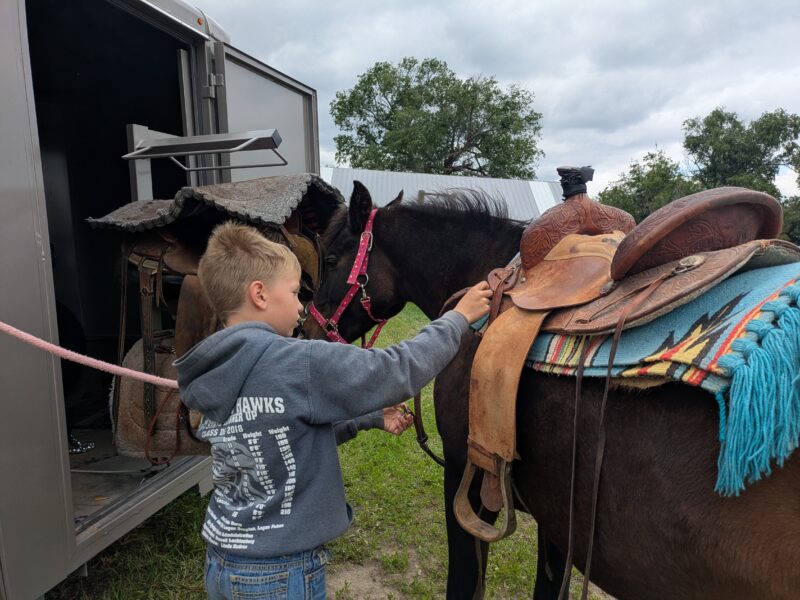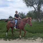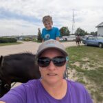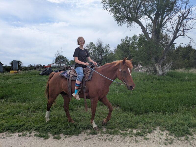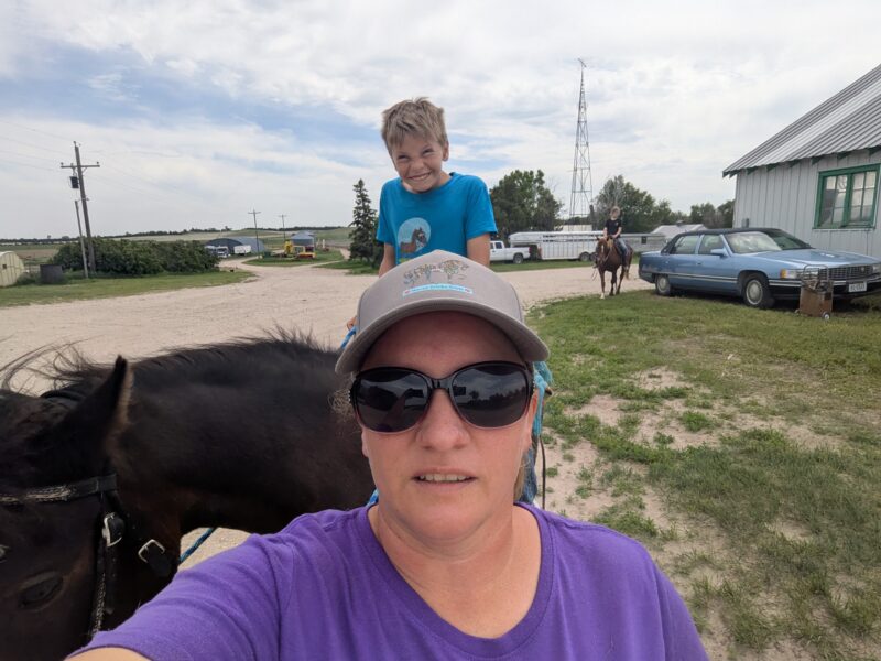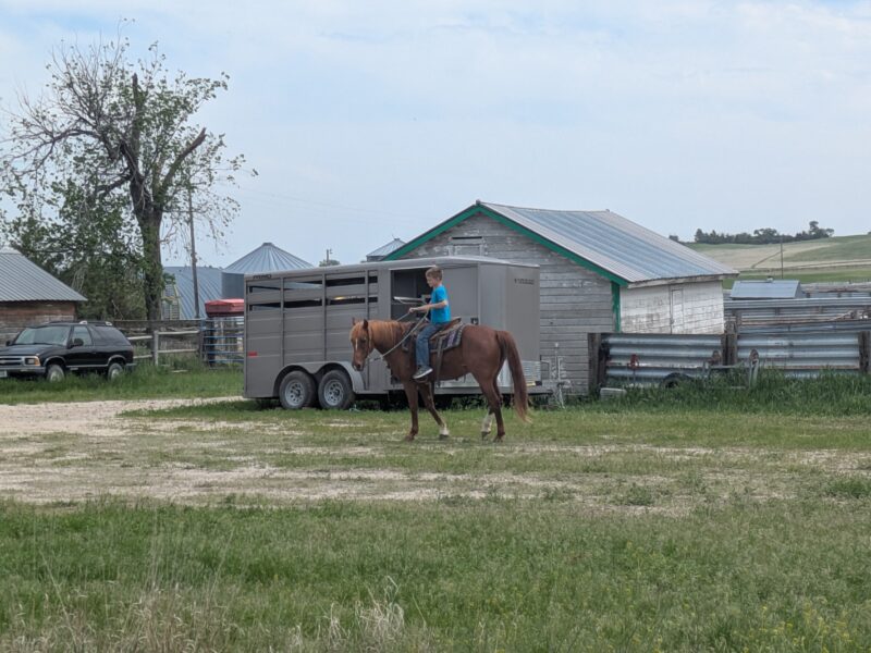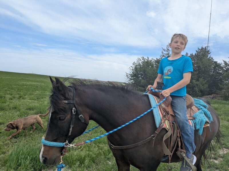 The boys wanted to ride though. Just because there were no girls didn’t have to mean no riding! The boys enthusiastically went out to catch their mounts. We got them saddled, they got on, and started riding around my driveway ‘arena’. I went to get Rusty.