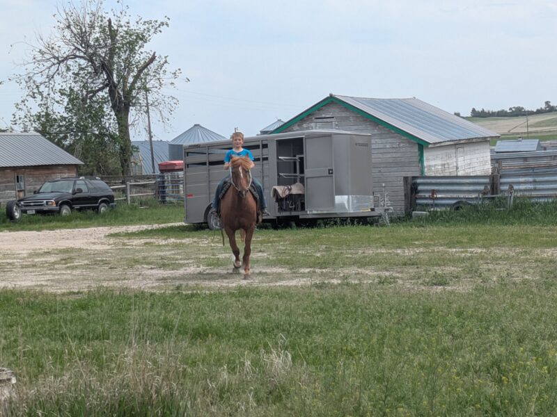 Luckily these were the boys not the girls. Yes, the girls ride better. But the boys are, well, boys. Who needs control? They could go fast! My son cantered, his friend gairted. They both zipped. I didn’t fall off Rusty and we manages to lead the energetic little group. Small circles at first, getting everyone cheerful and happy to be riding again. Then we went farther and farther afield. No hours heading out down the section lines like the girls have been doing. We did have a very nice ride around the yard and close fields.