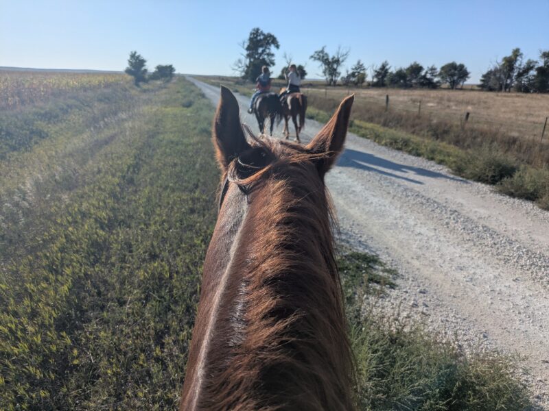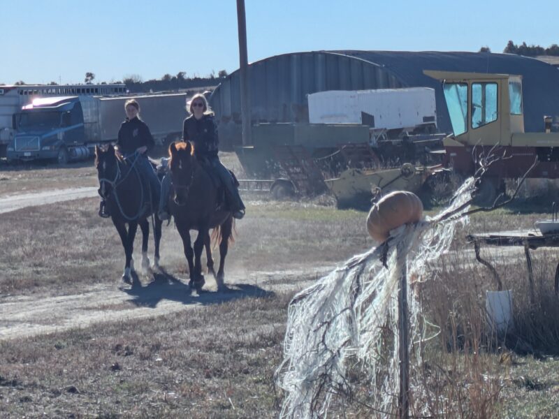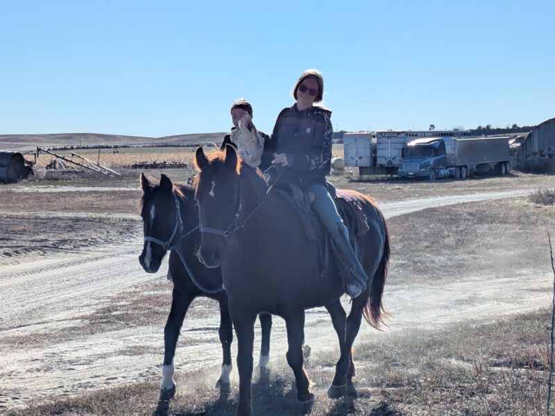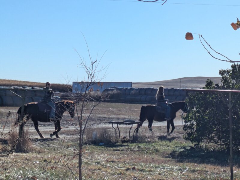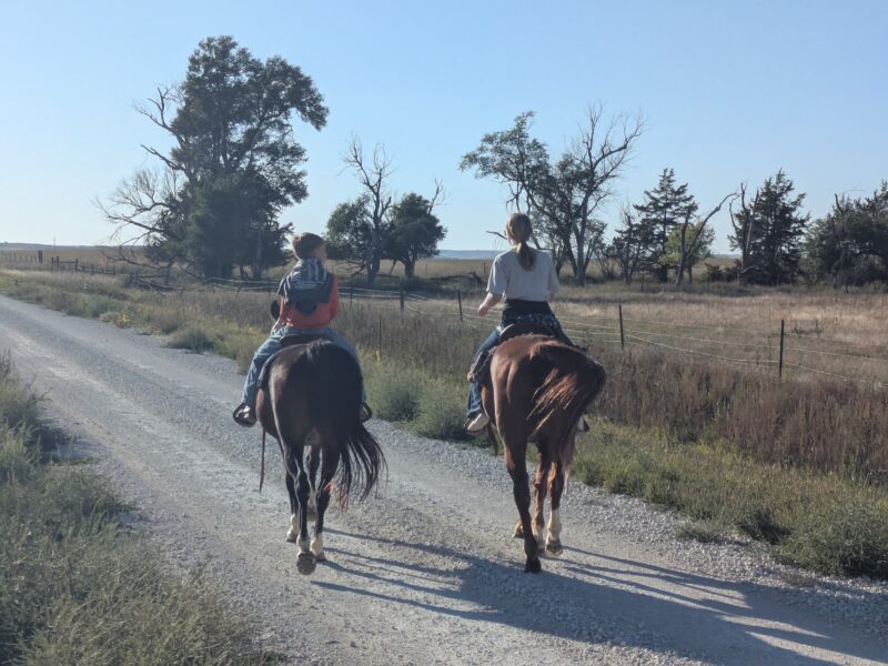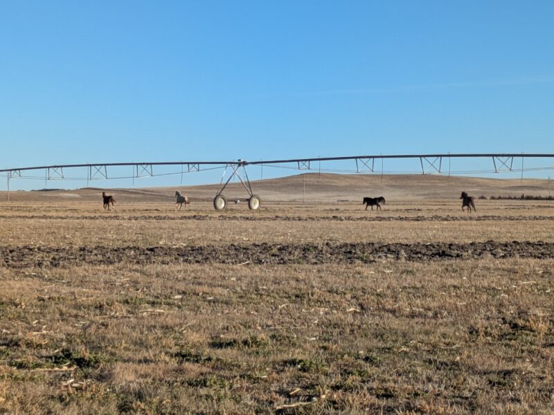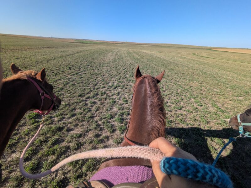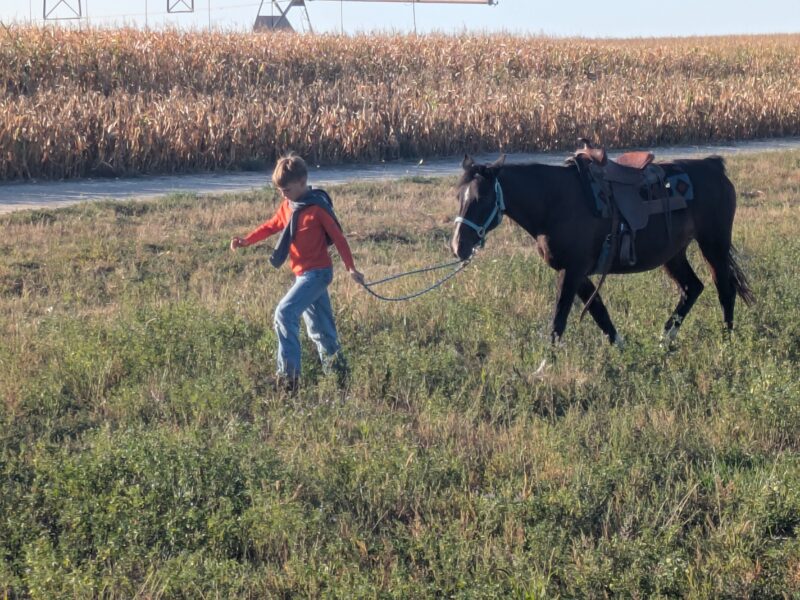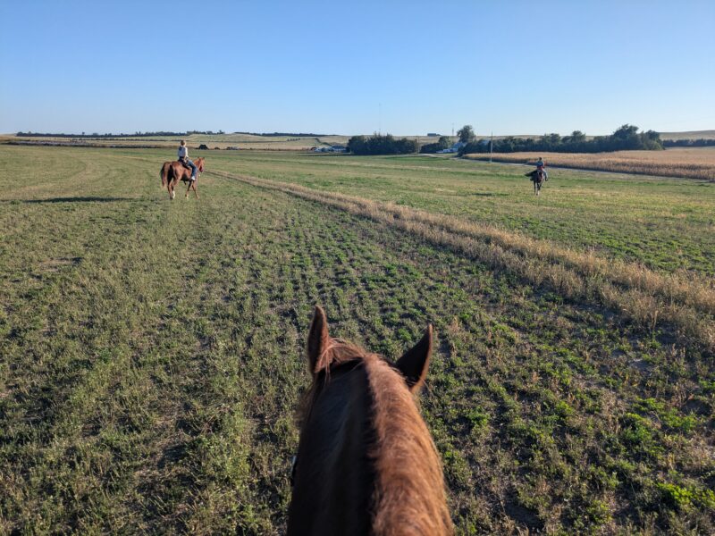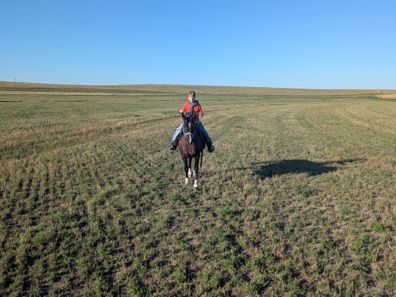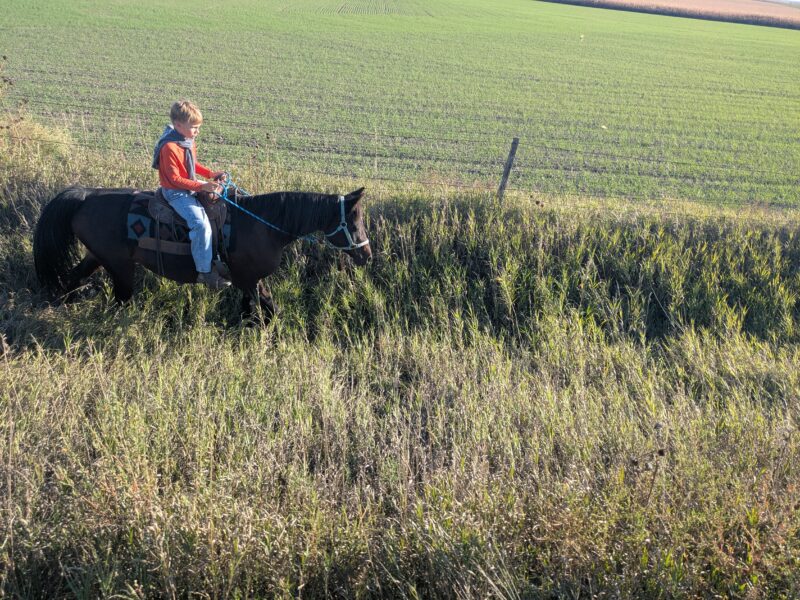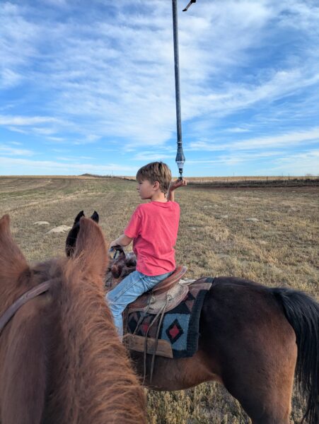 With everyone on the proper horse I got to enjoy my moment of joy. Both kids were happy and laughing. My son was zipping all over the place, trotting along on his wonderful little mare who loves to zip but will also stop. Jerry was plodding, as she does. We stopped to play under the pivot. Then it was over.