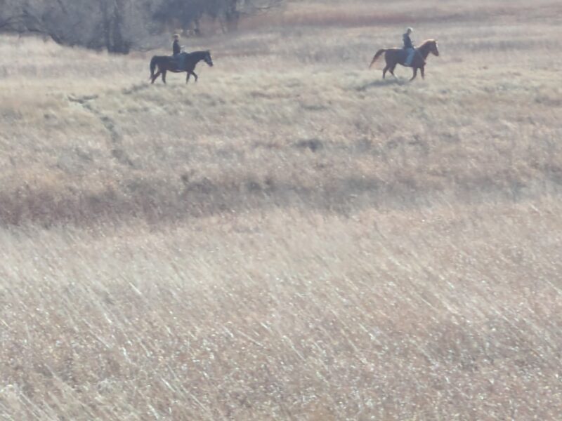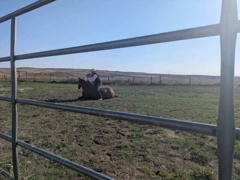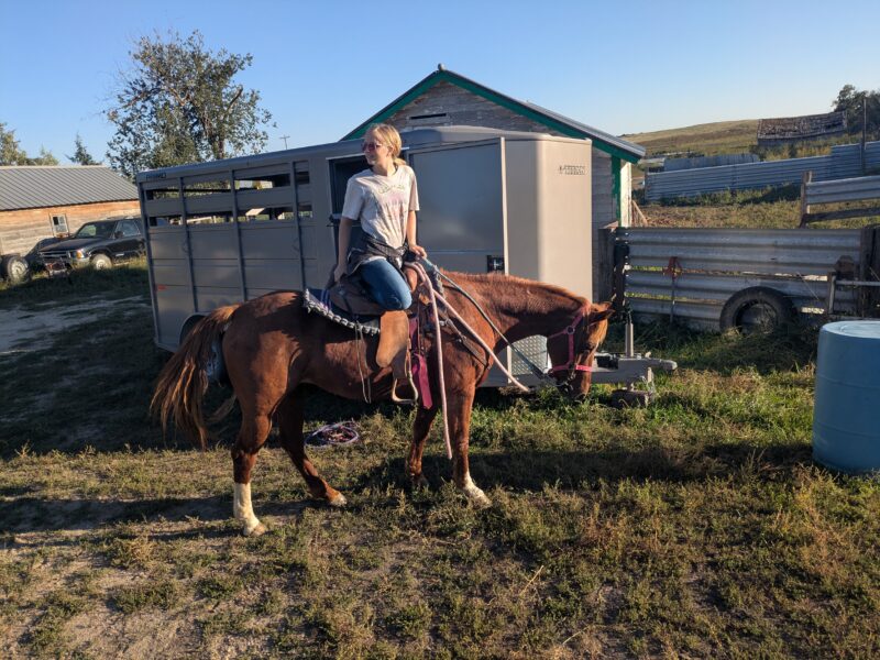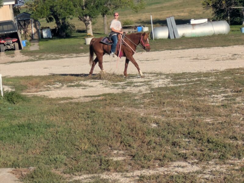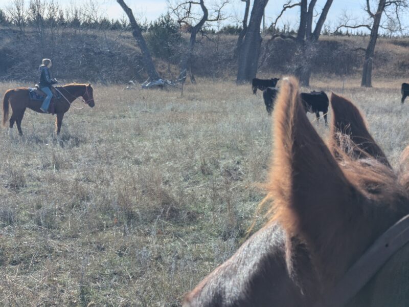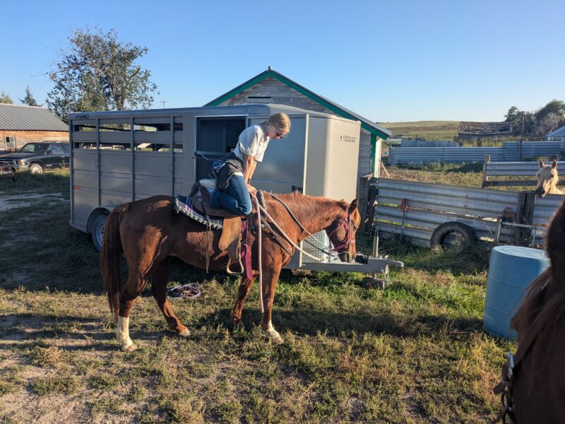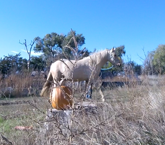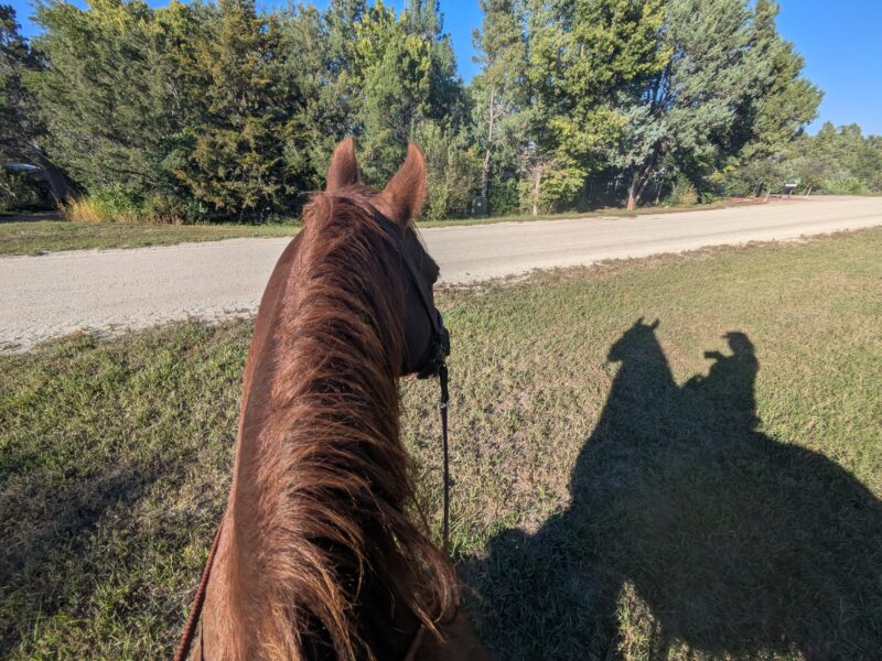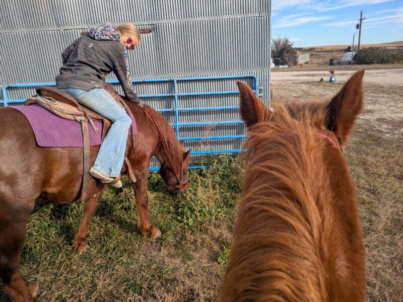 Rusty had fond a spot of good grazing and she was stuck there, unable to get his head up. She likes riding him, but was ready for her own horse back. Yay again! I would get to ride my own horse after all.