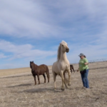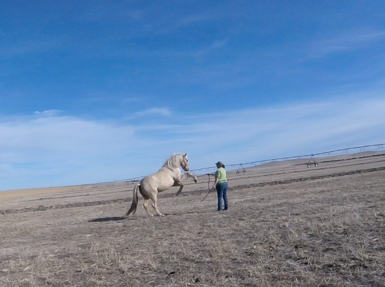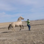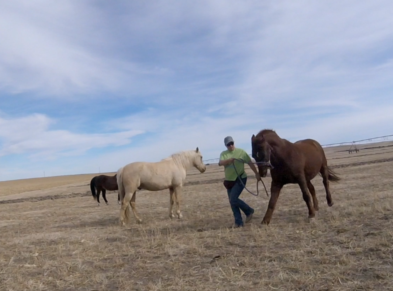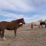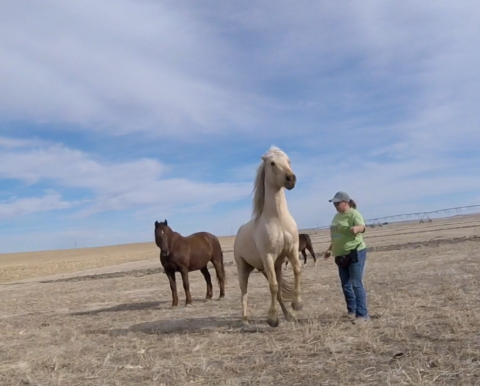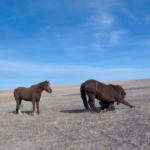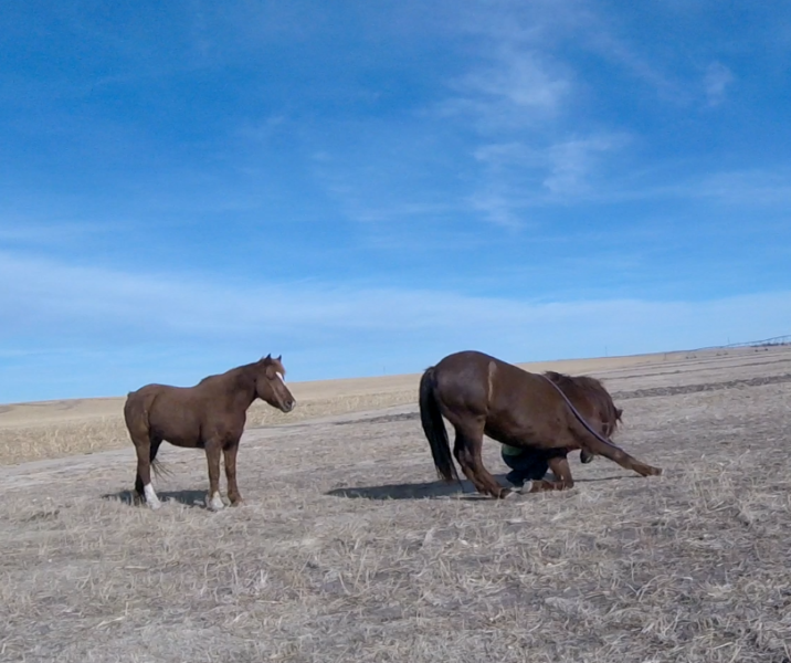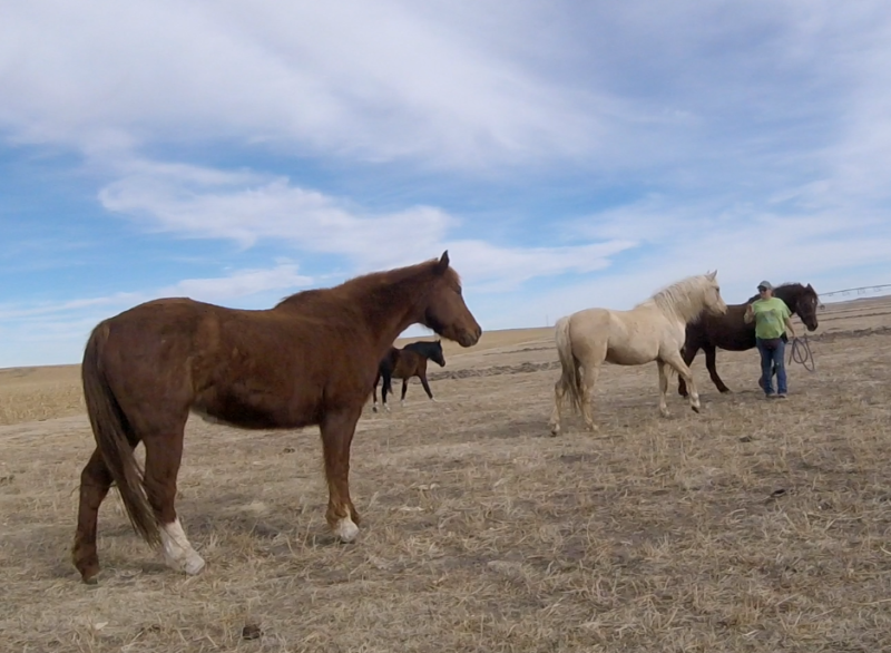 Between knowing the fence was good, the little remaining alfalfa being frozen down to nothing, and nights this week above freezing I’ve felt fairly safe turning the horses out there to graze. It’s half a pivot, so 80 acres? They get more exercise than they do standing in the corrals and best of all no dust! They get a couple few hours in the late afternoon to spend eating and wandering. It seems to be working. The mares are frisky, Rusty can breath, and Sunshine is getting experience in different areas.